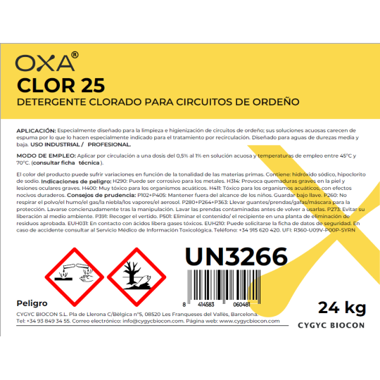 OXA - CLOR 25 es un detergente clorado especialmente diseñado para la limpieza e higienización de circuitos de ordeño; sus soluciones acuosas carecen de espuma por lo que lo hacen especialmente indicado para el tratamiento por recirculación. El producto esta especialmente diseñado para aguas de durezas media y baja, evitando la formación de velos e incrustaciones calcáreas en los equipos.