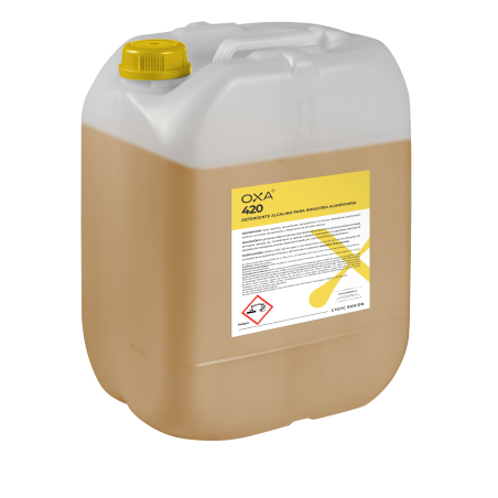 En general se utiliza en todo tipo de industria alimentaria como: cervezera, lácticos, enología, almazaras, cárnicas. etc. Generalmente se aplicará mediante recirculación en superficies interiores de depósitos, fermentadores, circuitos, líneas de envasado, etc. MODO DE EMPLEO Disolver OXA 420 en agua a una dosis entre un 0,5-5% en función del grado de suciedad de la superficie a limpiar y del nivel de incrustación. Aplicar la solución de lavado preferiblemente a temperaturas entre 30-80 ºC por recirculación, recircular el tiempo adecuado, generalmente entre 15-30 minutos. A menor temperatura, generalmente se requiere más tiempo de contacto.